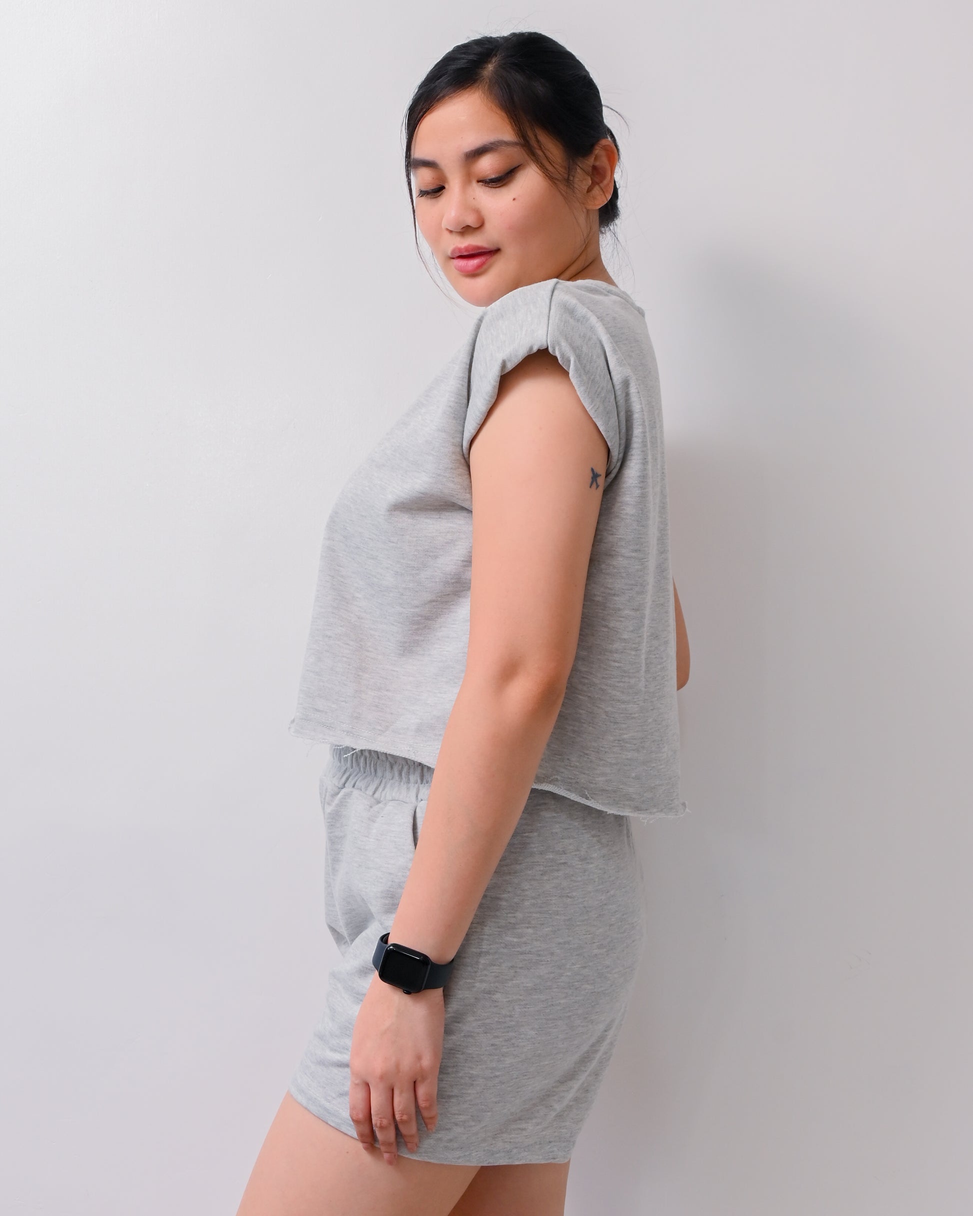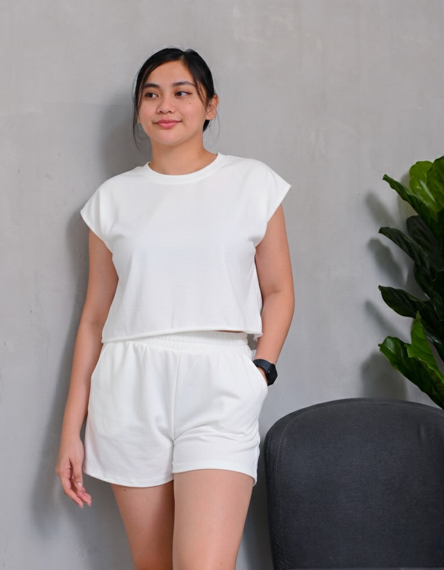 - Matching elastic waist shorts